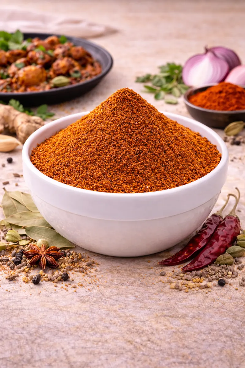 This Mutton Masala is tailored specifically to bring out the full-bodied richness of meat-based curries. Prepared with a balanced mix of roasted spices, herbs and aromatic seeds, it deepens flavour, enhances gravy texture and enriches the natural taste of tender mutton. Each spoonful carries warmth, colour and complexity, making every curry pot deeply satisfying. Use it while sautéing onions and tomatoes, mix into marination or add during slow cooking for layered, restaurant-style flavour. Whether cooked in pressure style, traditional stove-top or slow simmering, this blend delivers a hearty aroma that fills the kitchen and promises a delicious meal. Free from artificial colours and preservatives, the masala follows a home-style approach that works beautifully for biriyani gravy, kuska-style side dishes or dry pepper roasts. Perfect for family feasts, festive lunches or weekend meals, this masala transforms everyday mutton into a rich, flavour-packed dish every single time.